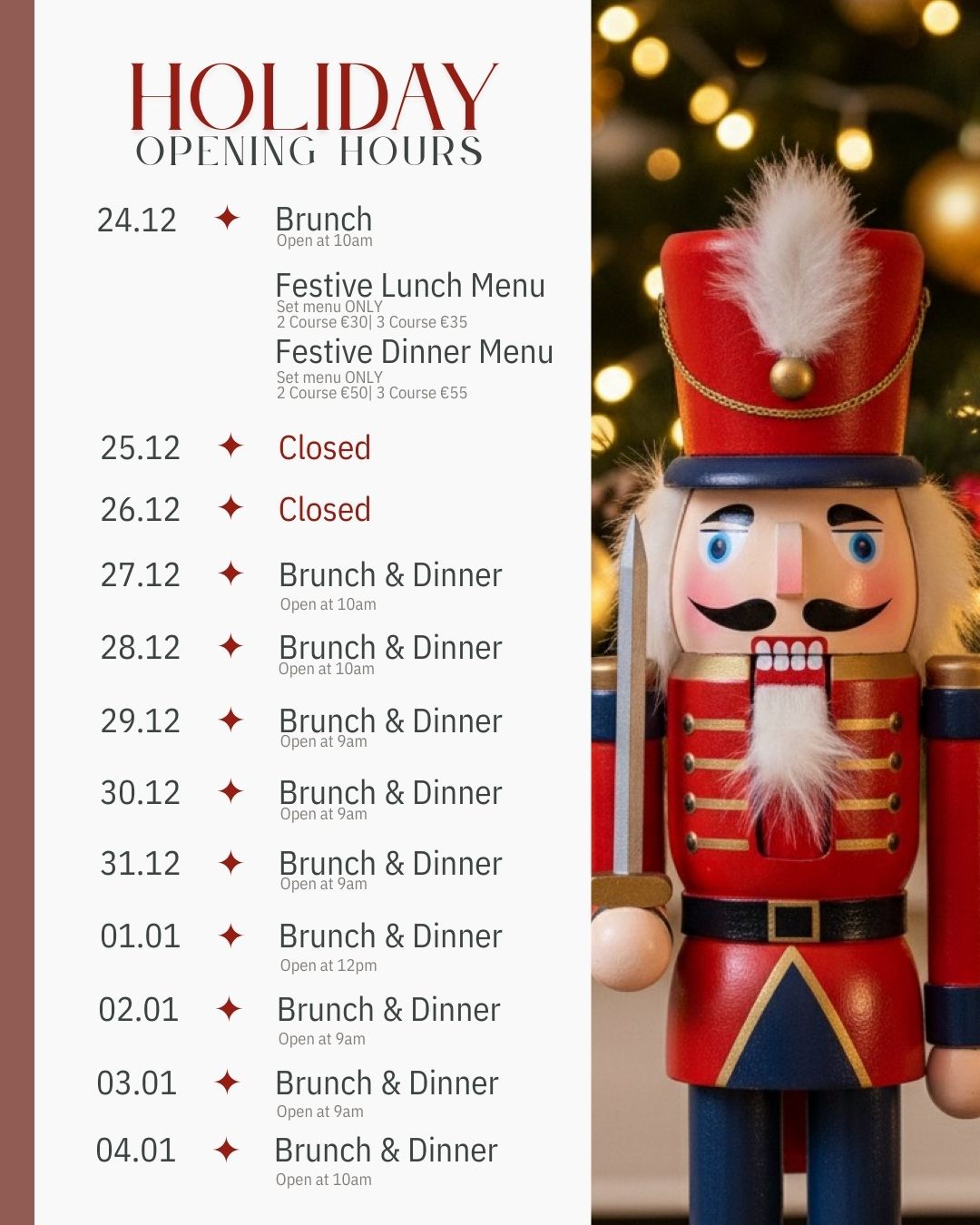 Our chefs are ready for the most wonderful time of the year with excitement and anticipation. They created a festive menus that are sure to please everyone. Our Festive Lunch Menu is priced at 2 courses €30 | 3courses €35 and the Dinner Menu is priced at 2 courses €50 | 3 courses €55.